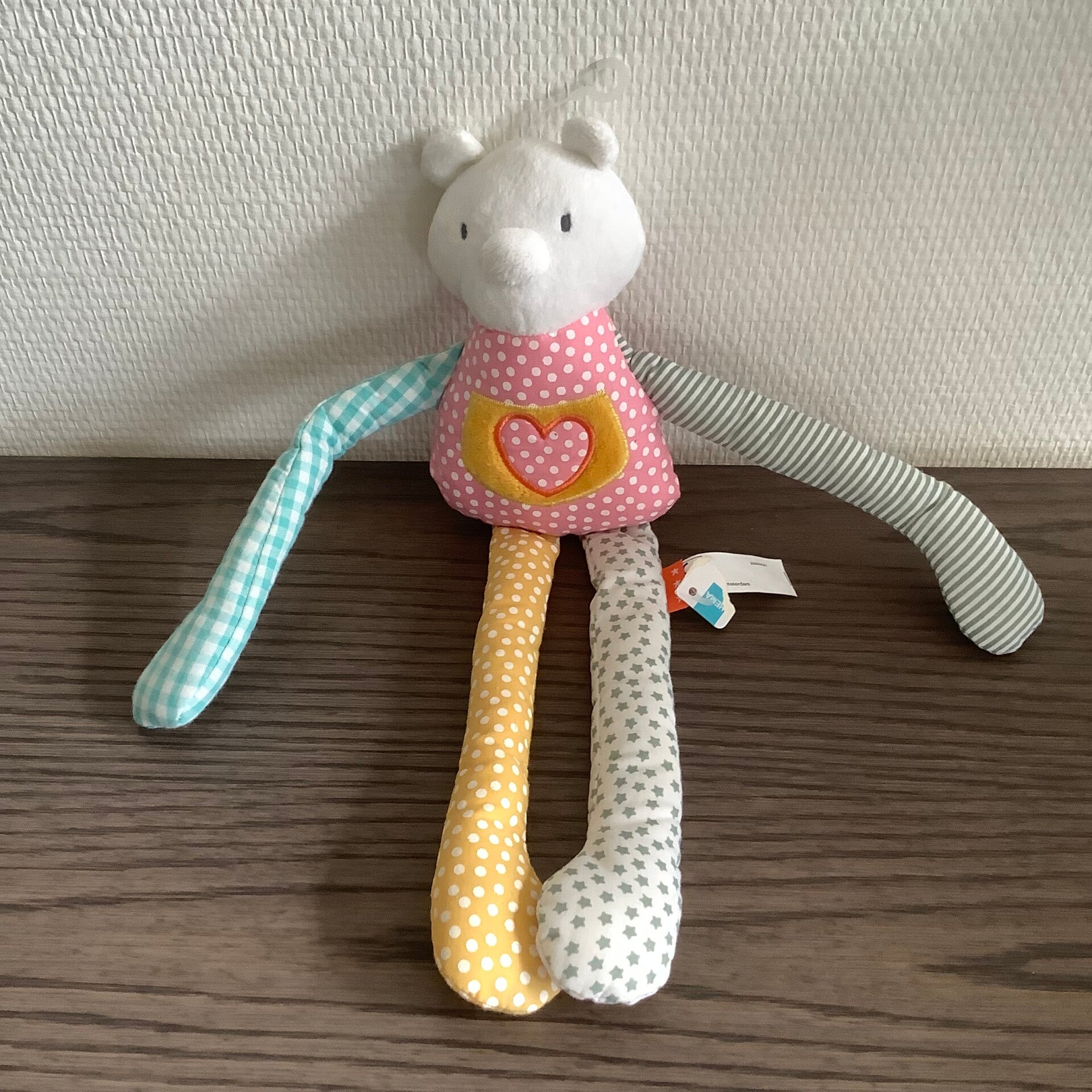 Voorzien van de label.Roze buik met hart.Heeft nog een deel van het kaartje eraan, want de knuffel is nog nieuw.